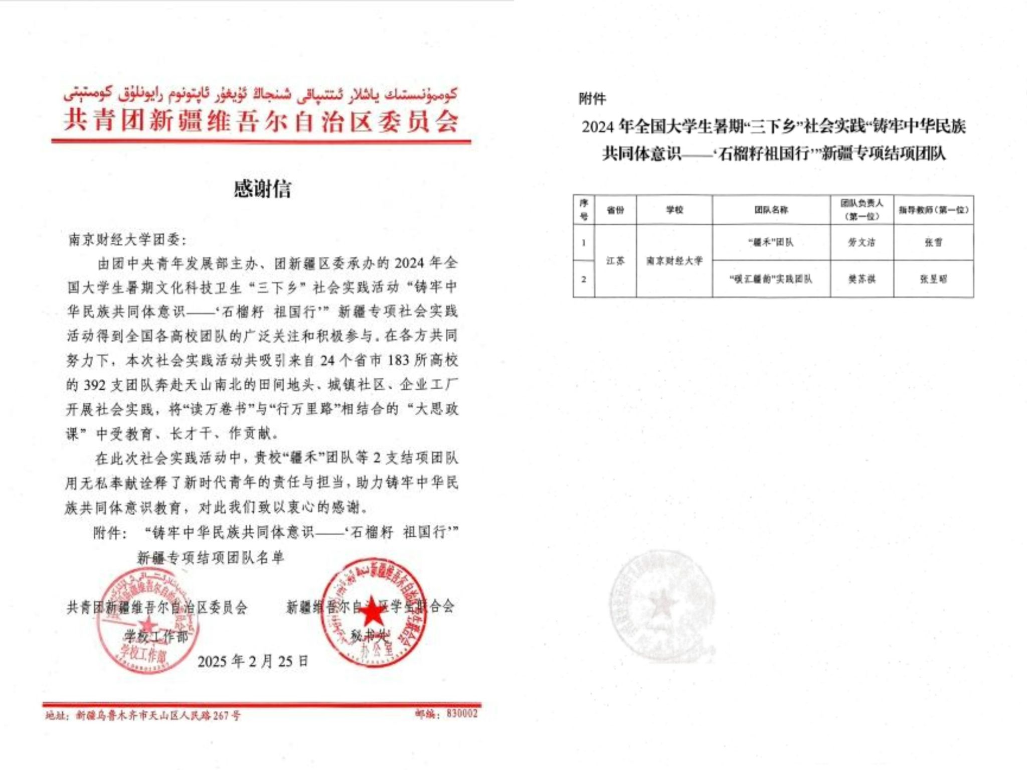 近日,共青团新疆维吾尔自治区委员会向beat365发来感谢信,对beat365师生团队在2024年全国大学生暑期文化科技卫生“三下乡”社会实践活动“铸牢中华民族共同体意识——‘石榴籽 祖国行’新疆专项”中的突出表现予以高度肯定。