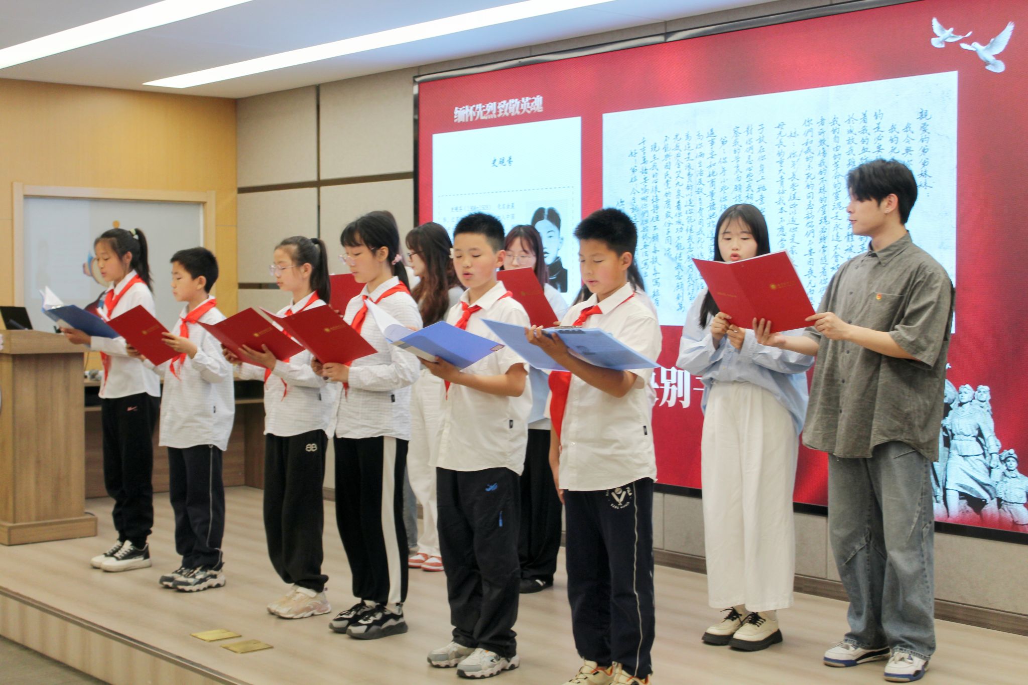 双方代表共同完成赠书仪式。随后,大学生代表深情诵读了郭凤韶、朱杏南、周执中等革命先烈的家书,字句铿锵,再现了英烈们为理想信念献身的赤子之心。在“大手牵小手”共读环节,6名大学生与6名小学生结对共读史砚芬烈士的《诀别书》,通过跨学段互动,让红色精神在共情共鸣中薪火相传。