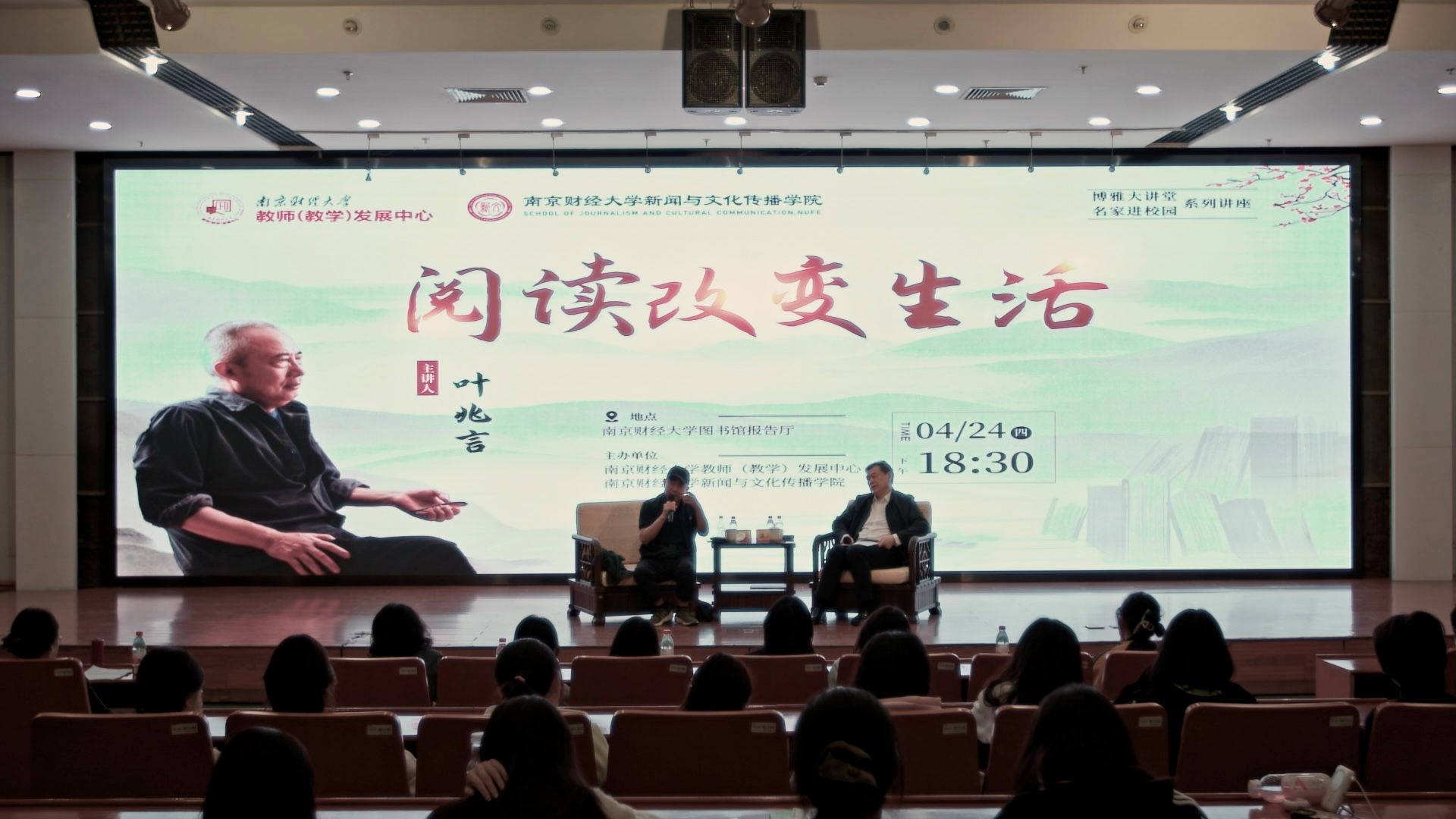 4月24日晚,由教师(教学)发展中心、新闻与文化传播学院联合主办的“名家进校园”系列活动之“阅读改变生活”主题分享会在仙林校区图书馆报告厅举行。中国作家协会第十届全国委员会委员、江苏省作家协会副主席、南京市作家协会主席、知名作家叶兆言受邀担任访谈嘉宾。新闻与文化传播学院教授温潘亚担任访谈主持人。近三百名师生参加活动。