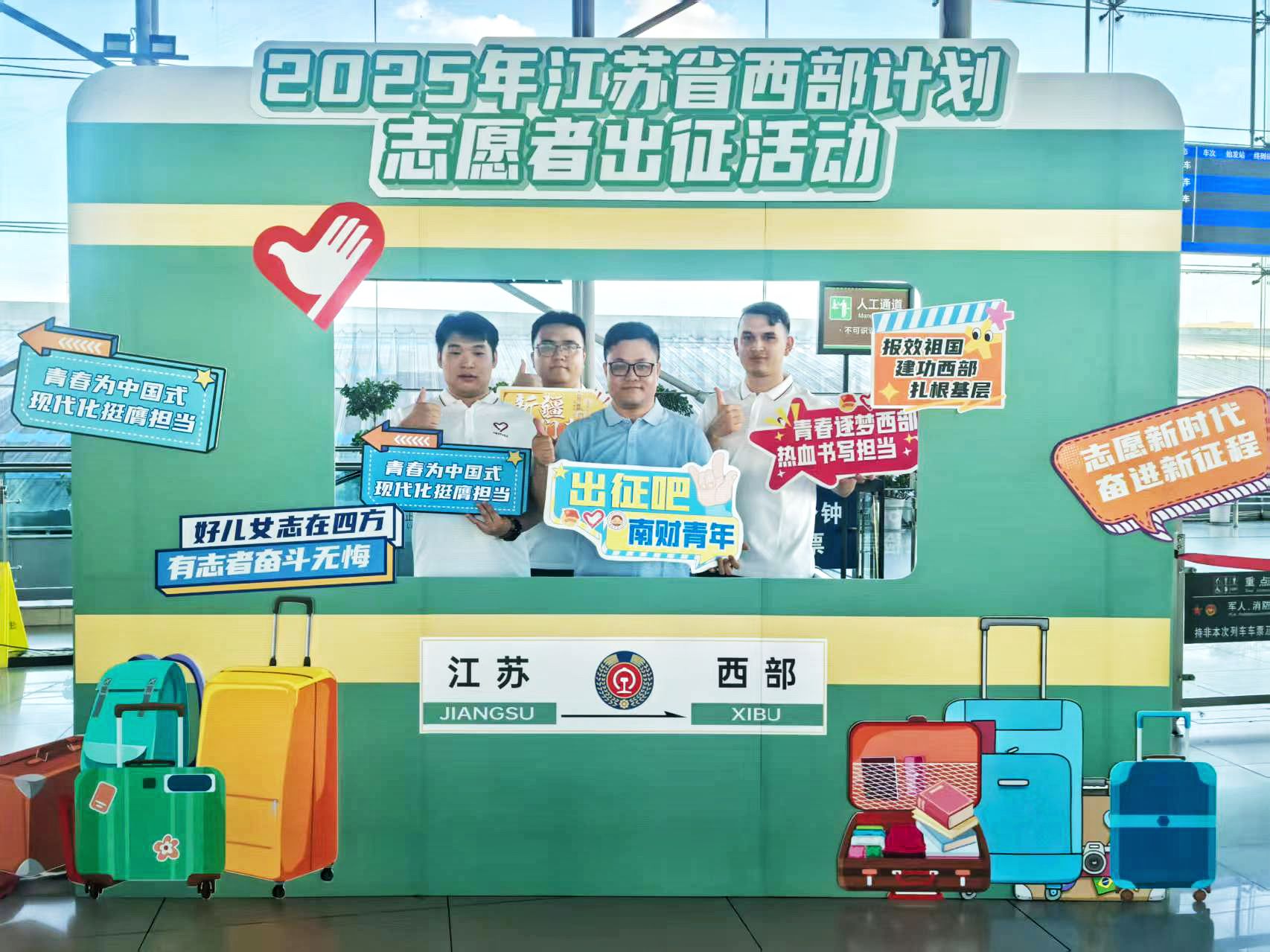 近日,2025年江苏省西部计划志愿者出征活动在南京站举行。团省委、中国铁路上海局集团有限公司南京铁路办事处、相关高校团委负责同志,江苏省西部计划志愿者代表等180余人参加活动。校团委副书记陈涛、beat365志愿者代表参加活动。