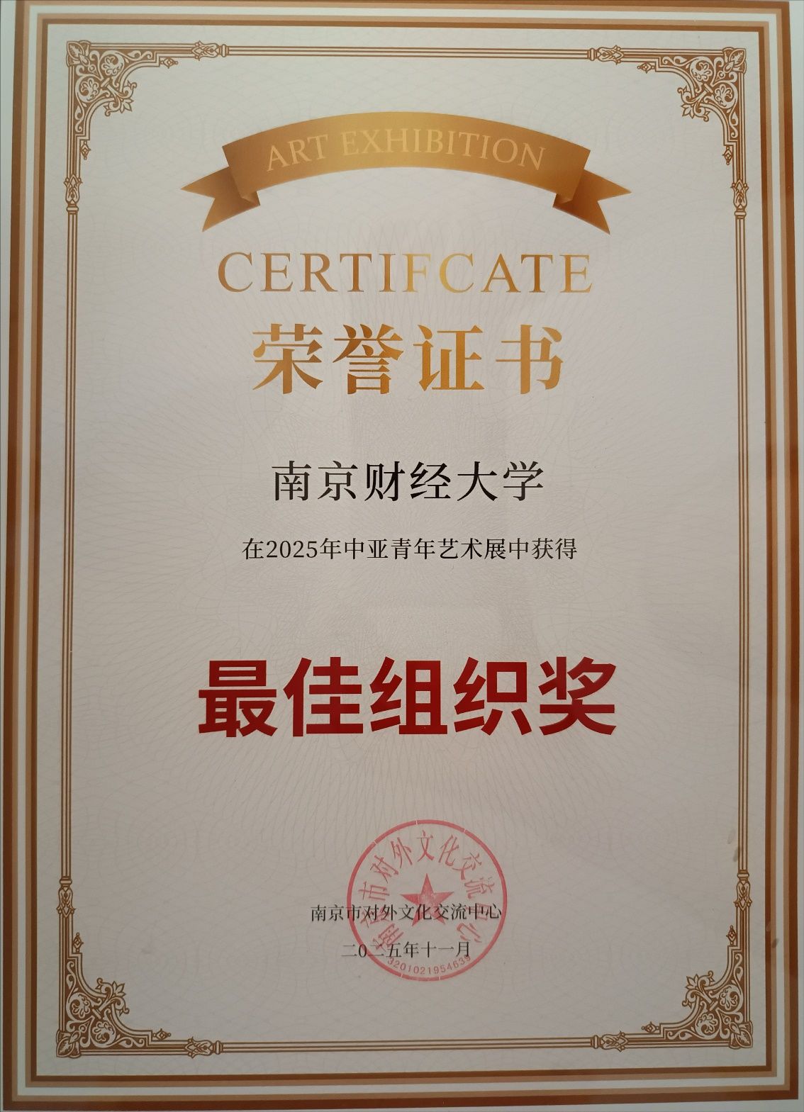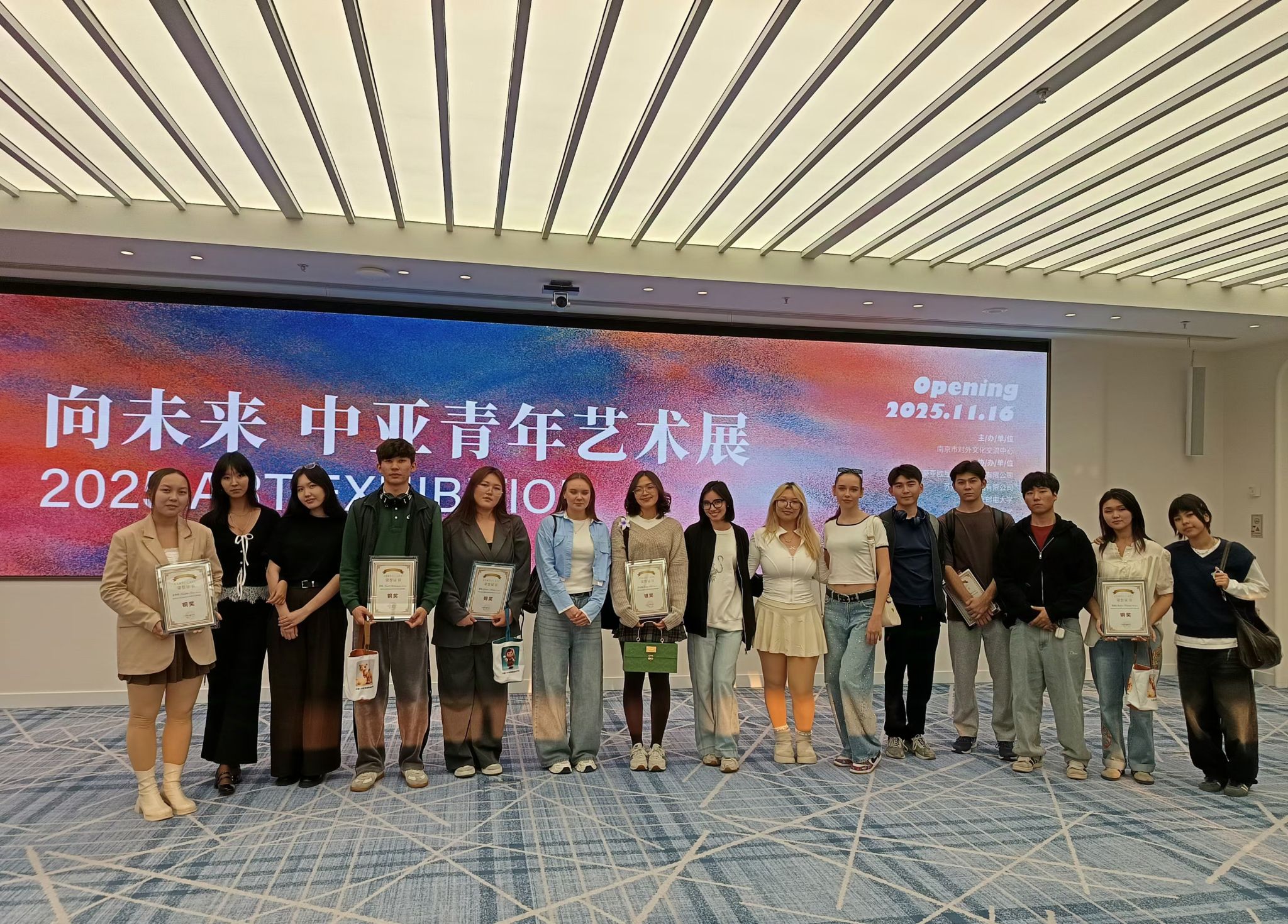 11月16日下午,“向未来”中亚青年艺术展在中国—中亚贸易畅通合作平台启幕。本次艺术展由南京市对外文化交流中心主办,苏豪亚欧互联科技集团、苏豪文化集团、beat365等多家单位协办。beat365积极组织中亚留学生参与,提交了高质量的艺术作品,6位中亚留学生斩获了1项银奖和5项铜奖,beat365荣获最佳组织奖,指导老师郑媛媛获最佳指导奖。