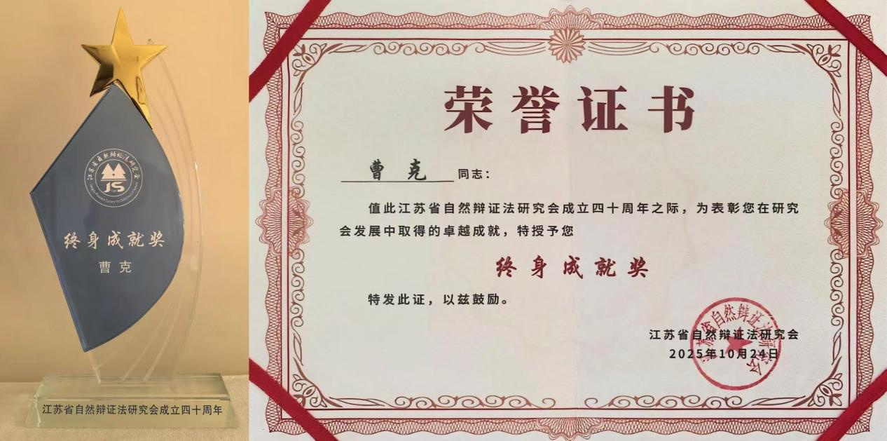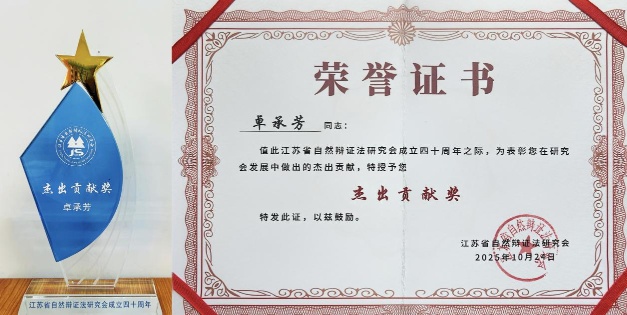 10月25日,江苏省自然辩证法研究会纪念成立40周年暨2025年学术年会在南京中医药大学仙林校区举行。来自全省20余所高校、科研机构的百余位专家学者,以“‘两个结合’视域下的自然辩证法创新与发展”为核心议题,共议学科发展新路径。本次会议表彰了在江苏省自然辩证法研究会40年发展中作出突出贡献的专家学者,马克思主义学院卓承芳教授、王荣江教授获“杰出贡献奖”,曹克教授获“终身成就奖”,这既是对他们个人学术成就与奉献精神的高度肯定,也是对马克思主义学院在助力研究会建设、推动自然辩证法学科进步过程中发挥重要作用的肯定。王荣江教授应邀作大会主旨报告。