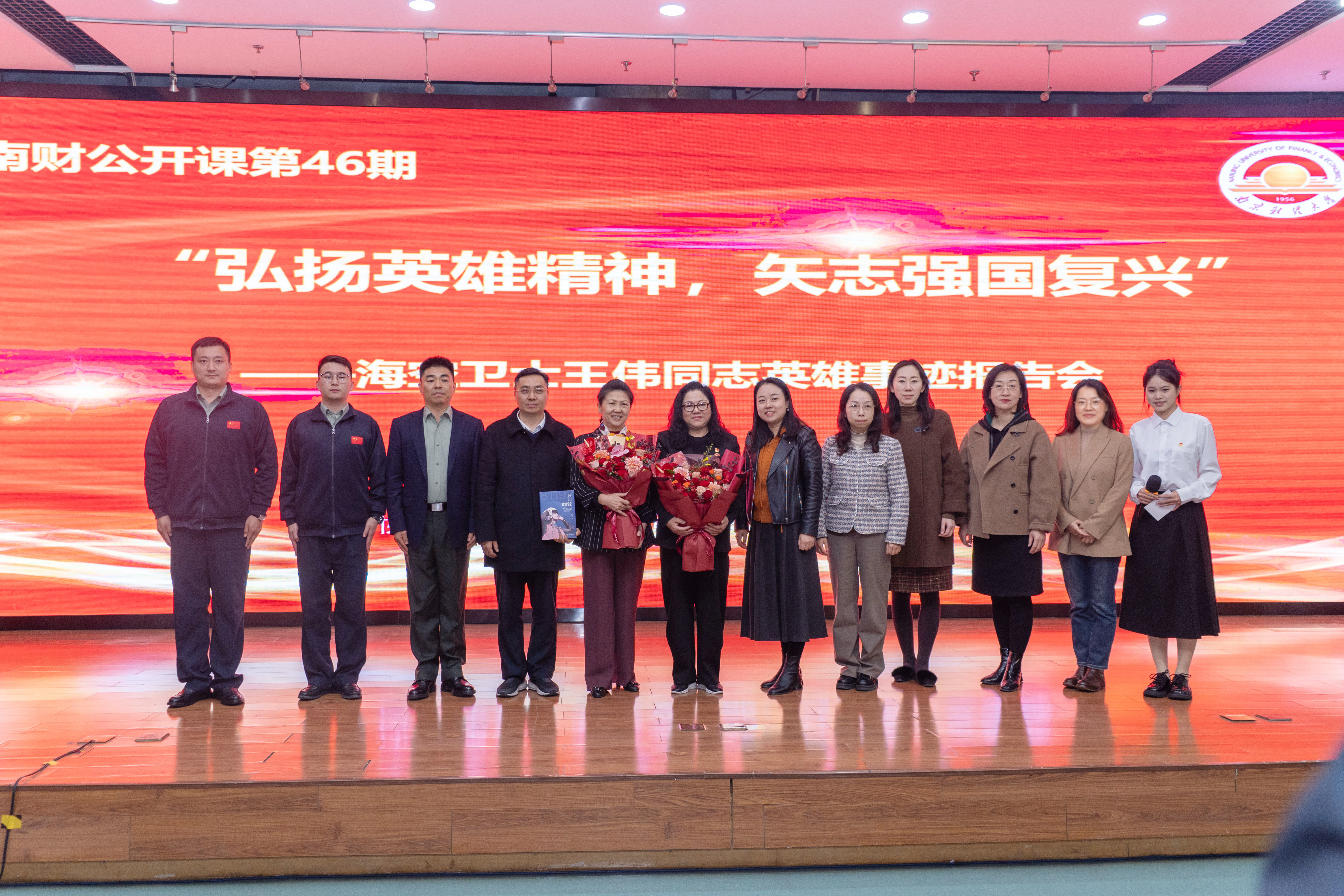 11月24日,第四十六期“南财公开课”在仙林校区图书馆一楼报告厅举行。本次公开课围绕“弘扬英雄精神,矢志强国复兴——海空卫士王伟同志英雄事迹报告会”主题,特邀爱国主义教育专业委员会首席顾问郭庆红和王伟同志夫人、海军上校阮国琴主讲。党委常委、宣传部部长朱军,党委研究生工作部部长郝园园,校团委书记张蔚伟,党委学生工作部副部长袁怡琨及马克思主义学院师生参加活动。