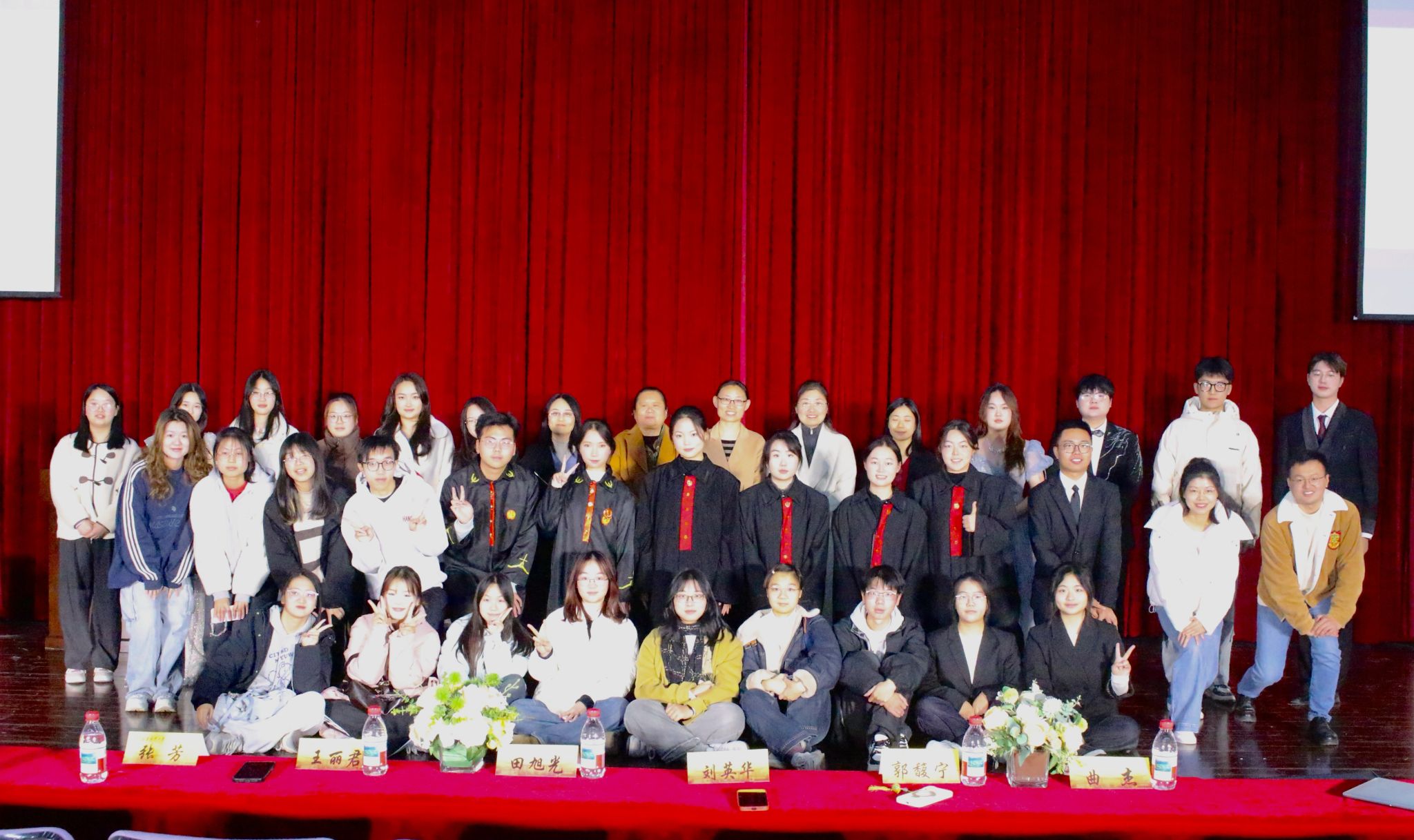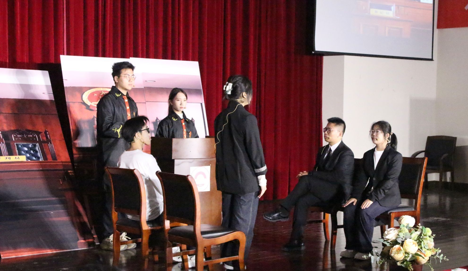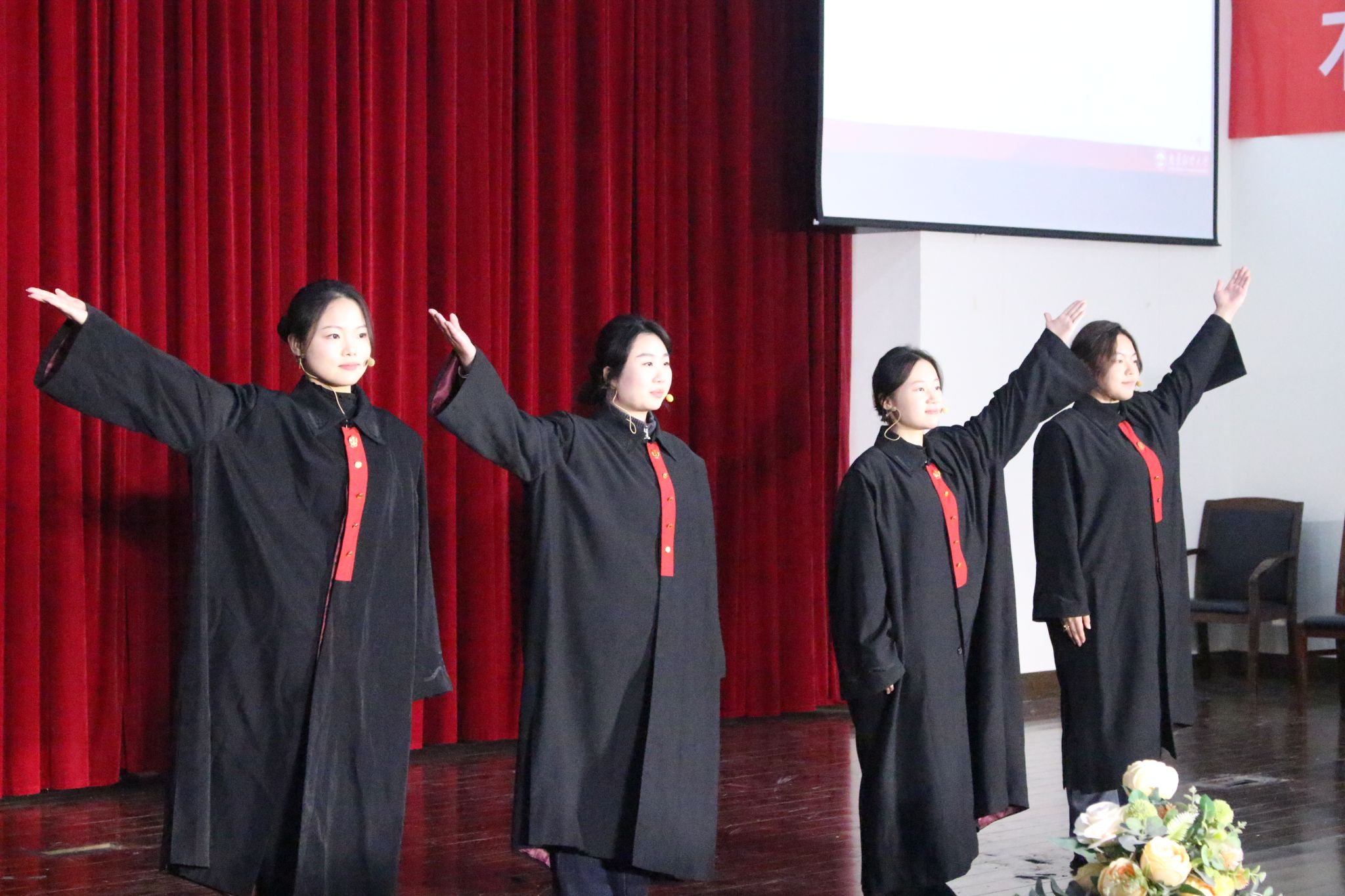 开幕式以情景剧《天平的抉择》拉开帷幕。同学们全情投入,从家事到国事,展现程序正义与法官坚守正义,融入非法证据排除、无罪推定等知识,彰显法治精神。随后,同学们朗诵《法律,我们永恒的誓言》,从《汉谟拉比法典》到罗马《十二铜表法》,从东方礼法到西方民主,展现法律悠久历史。朗诵铿锵有力,将法律升华为信仰,强化司法工作者忠诚,实现普法与激励效果。配音表演环节,同学们为电影《第二十条》配音,还带来动画改编配音,传播“正当防卫”知识,强调“法不能向不法让步”,感染力十足,使法律概念具象化,深化观众对公平正义的认识。歌曲《天地龙鳞》将开幕式推向高潮,展现了法学院学子的精神风貌,歌曲关联《中华人民共和国文物保护法》,将文化传承升华为法定责任,实现普法与爱国教育融合。