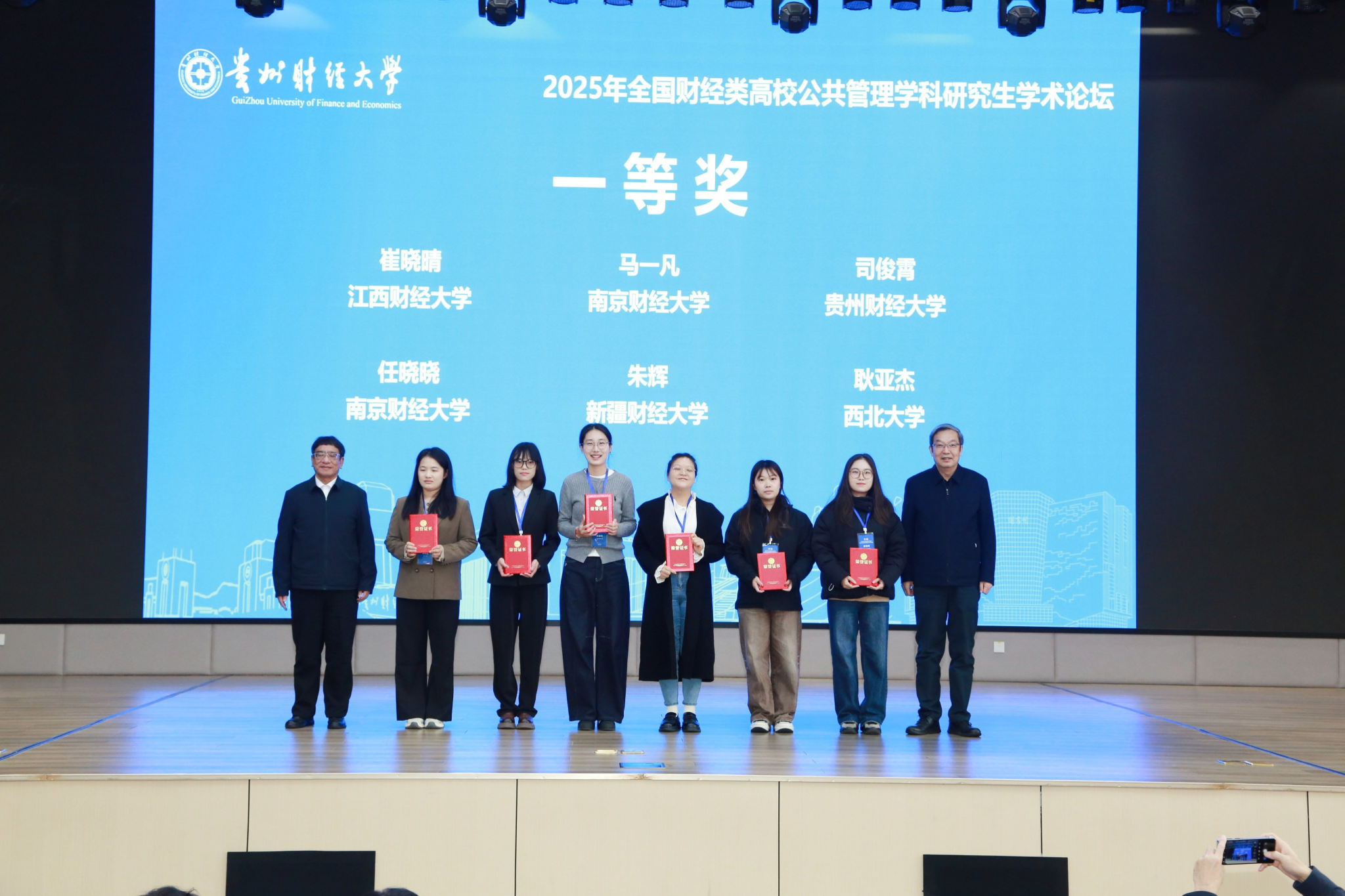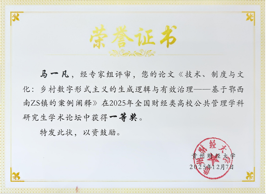 12月7日,2025年全国财经类高校公共管理学科研究生学术论坛在贵州财经大学举行。本次论坛汇聚了来自全国多所高等院校的专家学者及青年学子,共同探讨公共管理领域的前沿议题。公共管理学院院长黄建伟与三名硕士研究生应邀参加论坛,并围绕其最新的学术研究成果进行汇报与交流,其中,马一凡、任晓晓两名学生的论文获评一等奖。