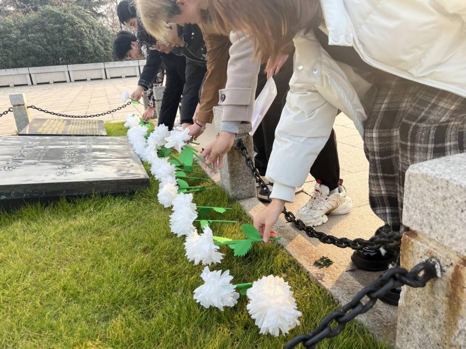 应用数学学院组织制作手工菊花,同学们分组协作,在庄重的氛围中完成作品。赴南京雨花台烈士陵园开展致敬活动,全体成员面向革命烈士纪念碑肃立默哀后依次上前,将亲手制作的手工制品敬献于纪念碑前,鞠躬致敬。随后,大家举起右拳庄严宣誓,铿锵誓言回荡在广场上空,彰显着新时代青年的责任与担当。
