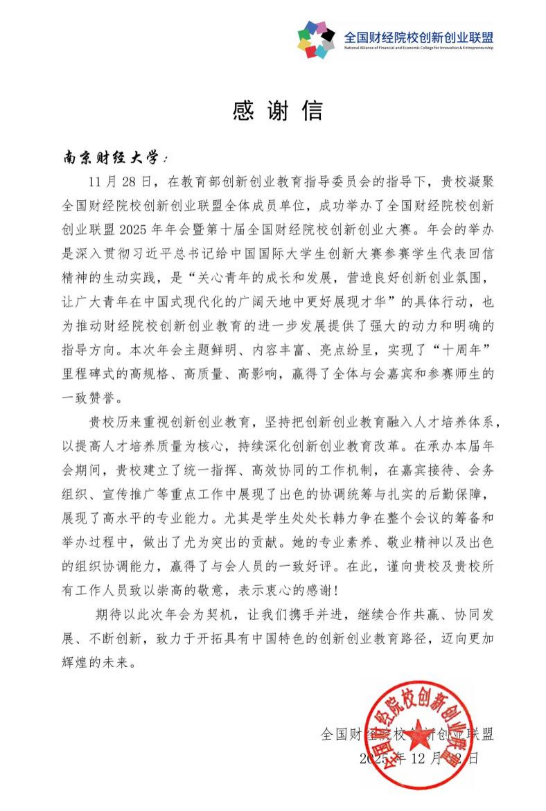 近日,全国财经院校创新创业联盟向beat365发来感谢信,对beat365承办全国财经院校创新创业联盟2025年年会暨第十届全国财经院校创新创业大赛给予高度肯定,并向学校及全体工作人员致以衷心感谢。
