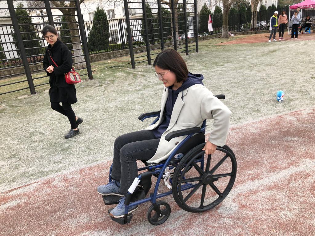 比赛的第一个项目让参赛选手戴着眼罩行走,参赛者必须带上眼罩,径直向前走20米的路程,最后以到达终点线后与指定参照物的距离来排名次。带上眼罩行走的同学无不战战兢兢,小心翼翼地挪步向前,有的同学走着走着就偏离了既定的方向,走成了一个弧形。他们一摇一晃地走完了全程,摘下眼罩的时候都不禁捏了一把冷汗。轮椅体验环节,参赛同学坐着轮椅,绕过障碍物,奔赴终点。他们笨拙地拼命推着轮椅的车轴,试图“走”得更快一点,但“双轮”不敌“两腿”,轮椅往往会不听指挥,停滞在一个地方无法动弹,这让参赛选手哭笑不得。