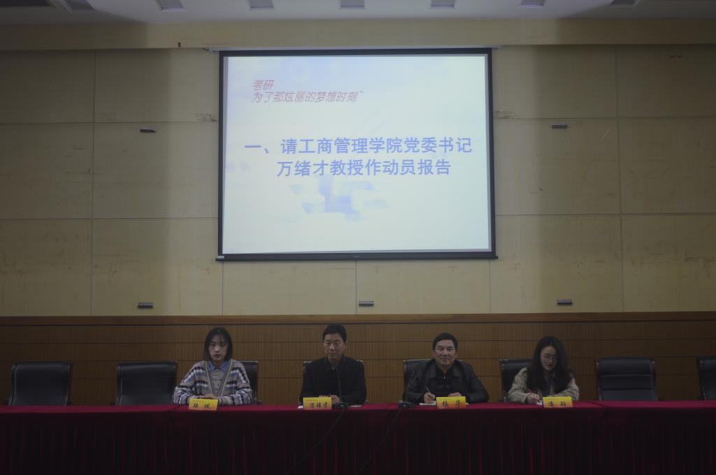3月27日下午,工商管理学院在beat365仙林校区德济楼报告厅召开了考研动员大会。工商管理学院党委书记万绪才给全体2016级学生作了考研总动员,工商管理学院校友、现南京大学2017级硕士研究生陆佩和南京理工大学2018级硕士研究生潘颖作了考研经验分享。院党委副书记杨华主持会议。