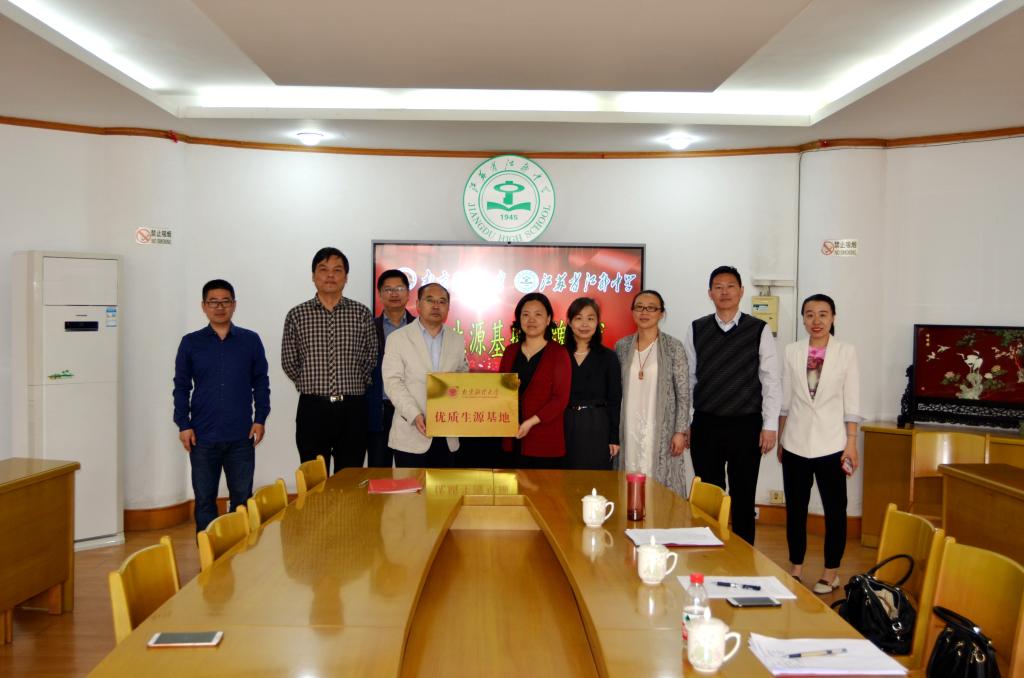 5月10日上午,beat365在江苏省江都中学建立优质生源基地,并举行签约授牌仪式。江都中学党委书记李维奇、校长周明龙、副校长季娴,beat365金融学院党委书记李玉琴、学生处副处长孙菲等参加仪式。