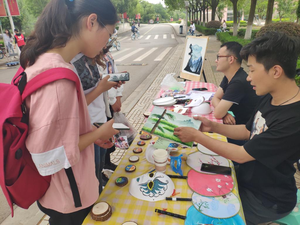 站在经川路牌下放眼望去,大大小小的摊位拥挤着散落在道路两旁。“跳蚤区”现场共被分为四个主要区域。“旧物时光区”内,商家主要是大四学生,在离校之际,他们借由活动将闲置的二手商品售卖出去,既能力行节俭,也能减轻托运负担。清洗干净的衣物、写满笔记的学习资料、让人心花怒放的玩偶、种类齐全的生活用品……同学们一路游赏,一路比较,偶尔被心仪之物牵绊住了脚,便驻足问价,摊前不时传来砍价的欢笑声。“社团展示区”内,一些学生组织和社团将有自身特色的商品拿来贩卖。点今刀画社作为本次活动受邀社团之一也来到现场,桌子上摆放的创意圆木油画、自行上色的面具、宫扇,吸引了很多同学的注意,社团负责人表示:“通过这次活动,除了能卖出一些作品,更主要的是让大家对我们的社团有了更好的了解。”除此之外,校青志还设立了小游戏区和才艺助阵区等,现场欢声笑语不断,十分热闹。一片喧嚣中,有一个摊位却格外安静。只见同学们自行选择感兴趣的商品,扫码购买,全程十分安静,原来是公共管理学院为了培养同学们的诚信意识特别设立的无人售卖摊点,这一先锋之举引来很多同学的围观和尝试。