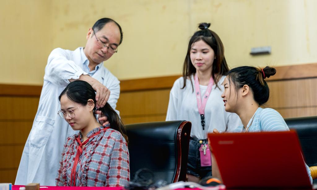 讲座后,围绕留学生在夏季的身体状况,顾兆军教授现场演示望闻问切,并给学生针灸、拔火罐,让留学生亲身体验了中医保健的神奇魅力。