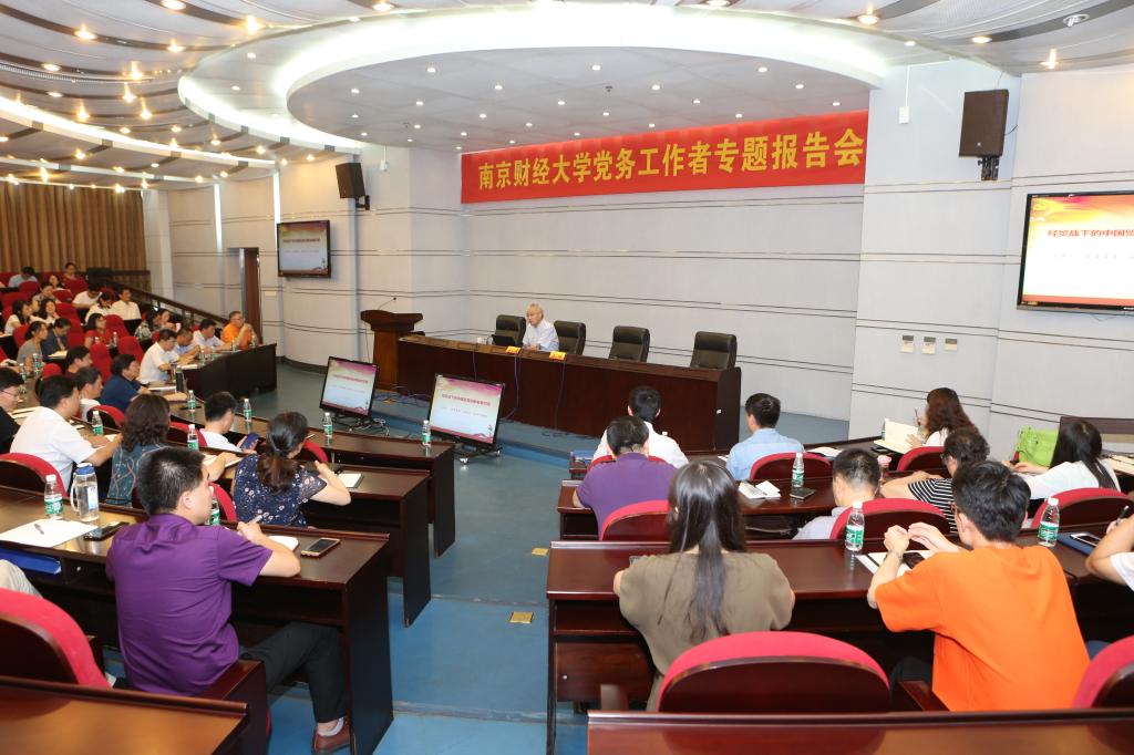 7月3日下午,校党委常委、副校长张为付为全校党务工作者作《经贸战下的中国贸易创新发展对策》的专题报告,引导广大党务工作者不忘初心、牢记使命,进一步增强“四个意识”、坚定“四个自信”、做到“两个维护”。党校常务副校长、党委组织部副部长衣琳主持报告会,机关部分支部全体党员、各基层党组织书记、党务工作者聆听了报告。