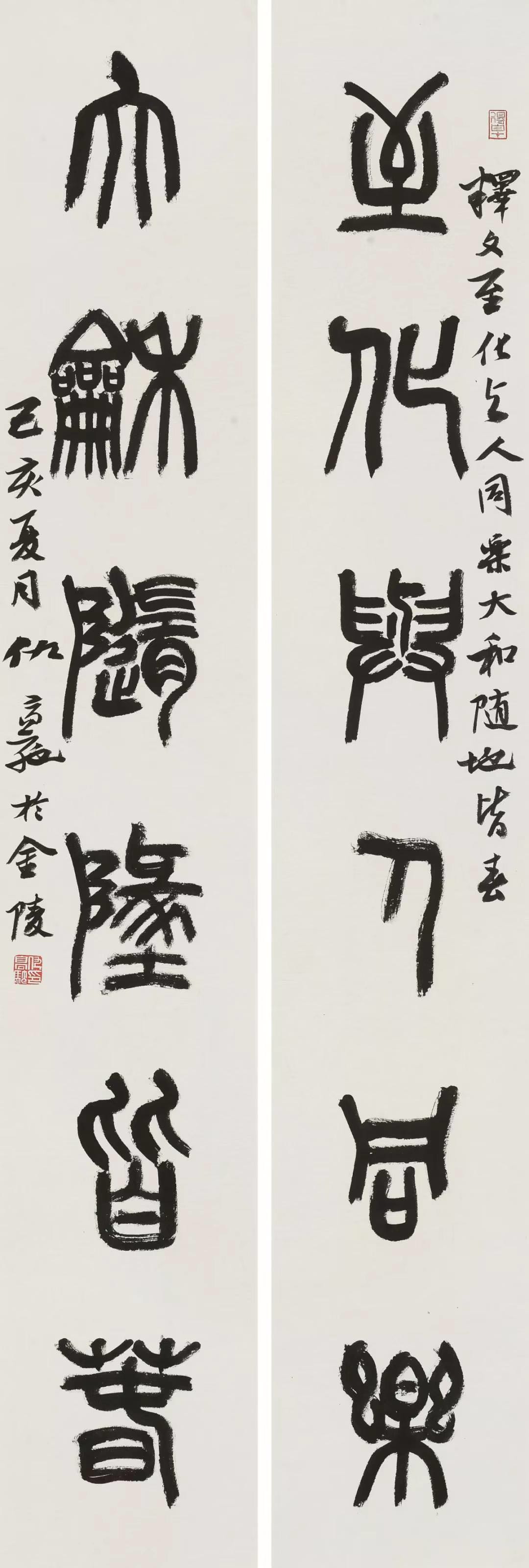 仇高驰教授的书法作品《至化与人同乐,大和随地皆春》,寓意天下大和、向善同乐、四处皆春;蒋平老师的书法作品内容“星垂平野阔、月涌大江流,飘飘何所似、天地一沙鸥”取自杜甫的《旅夜书怀》,篆刻作品以“明德”居首,寓意弘扬正气国风。两位老师的作品以其深刻的艺术性、鲜明的主题性,表达了身处国泰民安新时代的喜悦之情和感恩之念。