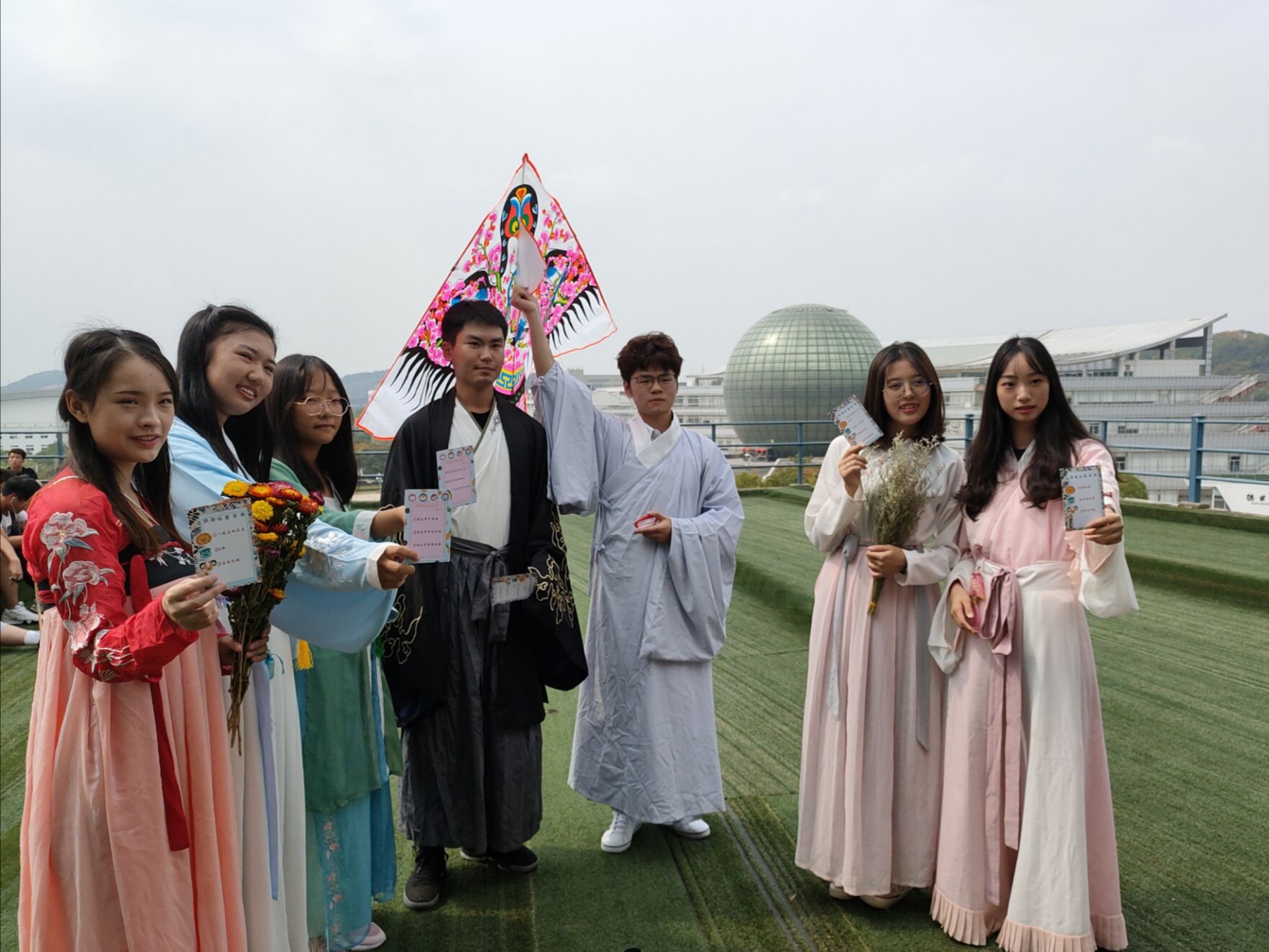 近日,管理科学与工程学院学生在仙林校区德济楼五楼草坪举办了主题为“汉服穿越,梦回重阳”的重阳节活动。学生们制作了“萌萌哒爱老券”送给长辈,着汉服佩茱萸,赏菊赋诗,浅酌菊花酒,细品重阳糕,放飞纸鸢,重温古典文化的同时传承尊老爱老的传统美德。