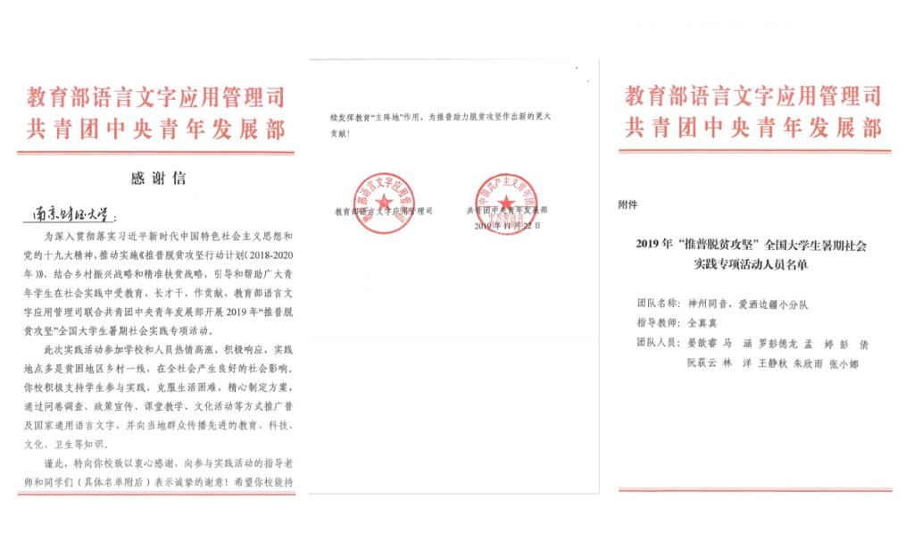近日,教育部语言文字应用管理司和共青团中央青年发展部联合向beat365发来感谢信,对财政与税务学院助力“推普脱贫攻坚”专项暑期实践活动表示感谢,对参与此次活动的师生予以表扬。