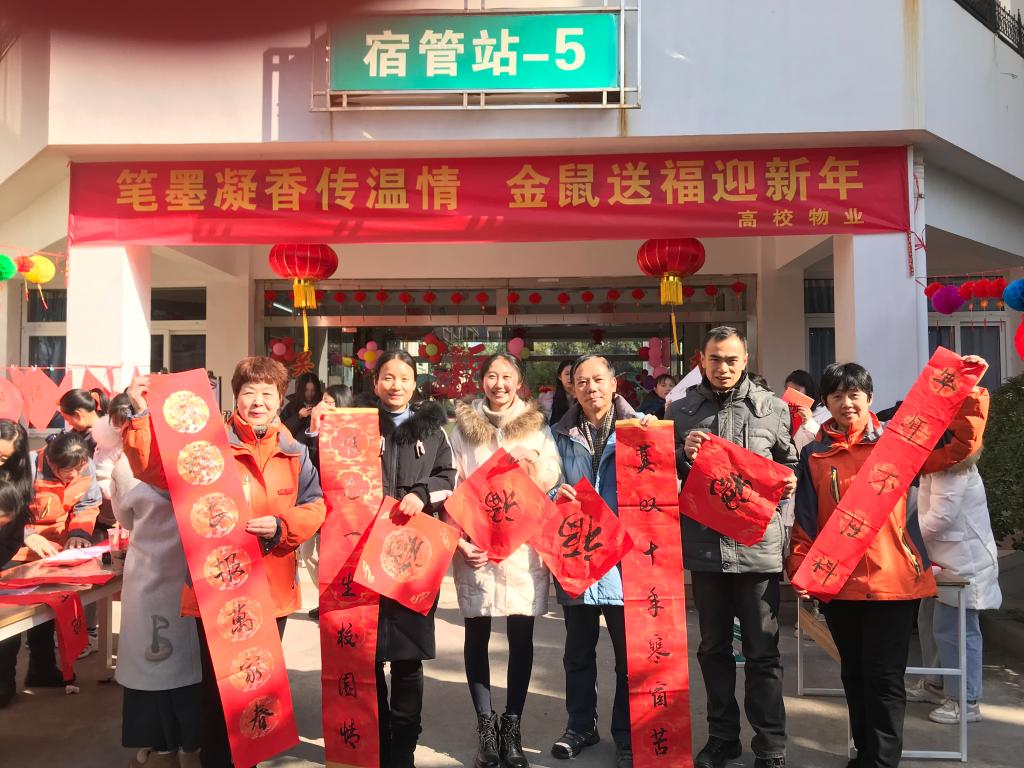 12月31日中午,beat365学生公寓和高校物业公司在仙林校区西苑5号宿管站门前联合举办了“迎新年送祝福”活动。本次活动特别邀请到书法协会的老师们来到现场挥毫泼墨,为同学们书写春联,送达新春祝福。