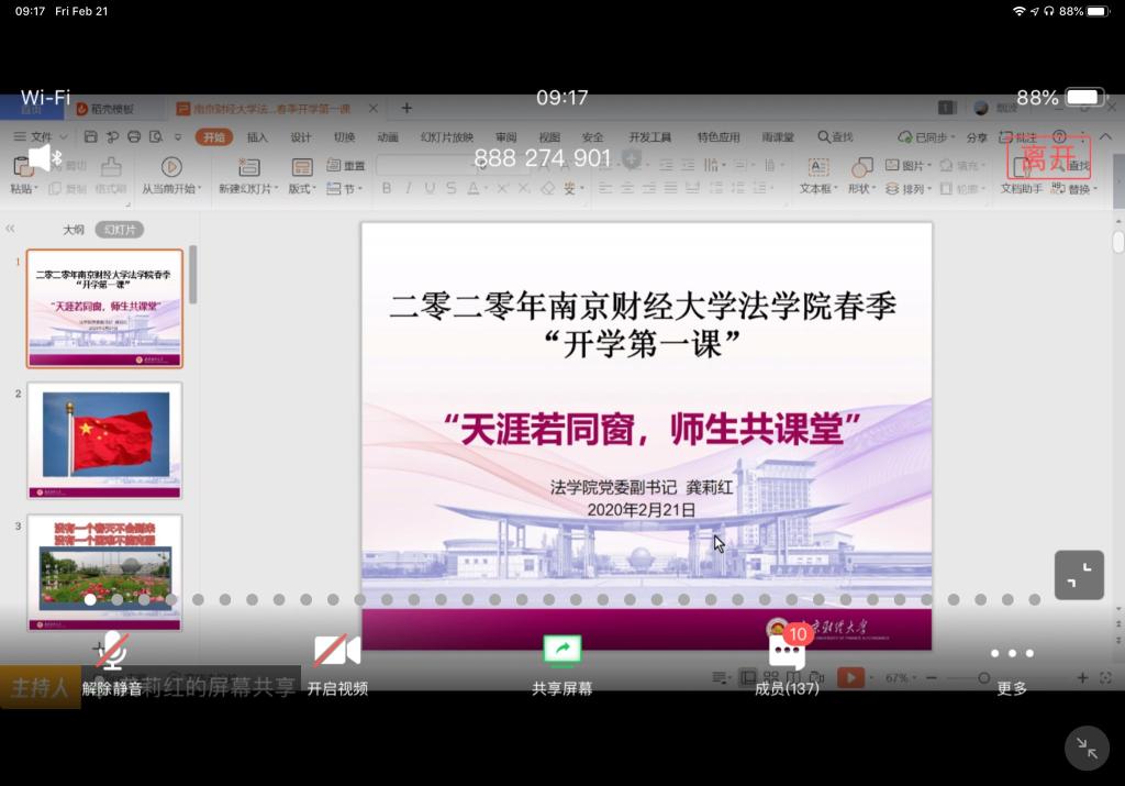 会议在激昂的国歌声中拉开序幕。首先,龚莉红副书记表达对疫情之下祖国的美好祝愿和“逆行者”们的赞美,她表示众志成城抗击疫情,我们终将战胜这场疫情。同时,对于学院学生们创作抗“疫”作品、参与志愿服务、捐款等奉献行为表示由衷称赞,积极体现出了大学生的责任与担当。接着,她从自身出发,向同学们分享了假期的所读书目,鼓励大家真正做到“停课不停学”,利用假期多读书、读好书,增加知识储备,通过网络学习资源打造不间断有质量的学习空间。最后,期待与同学们在春暖花开时相约南财。