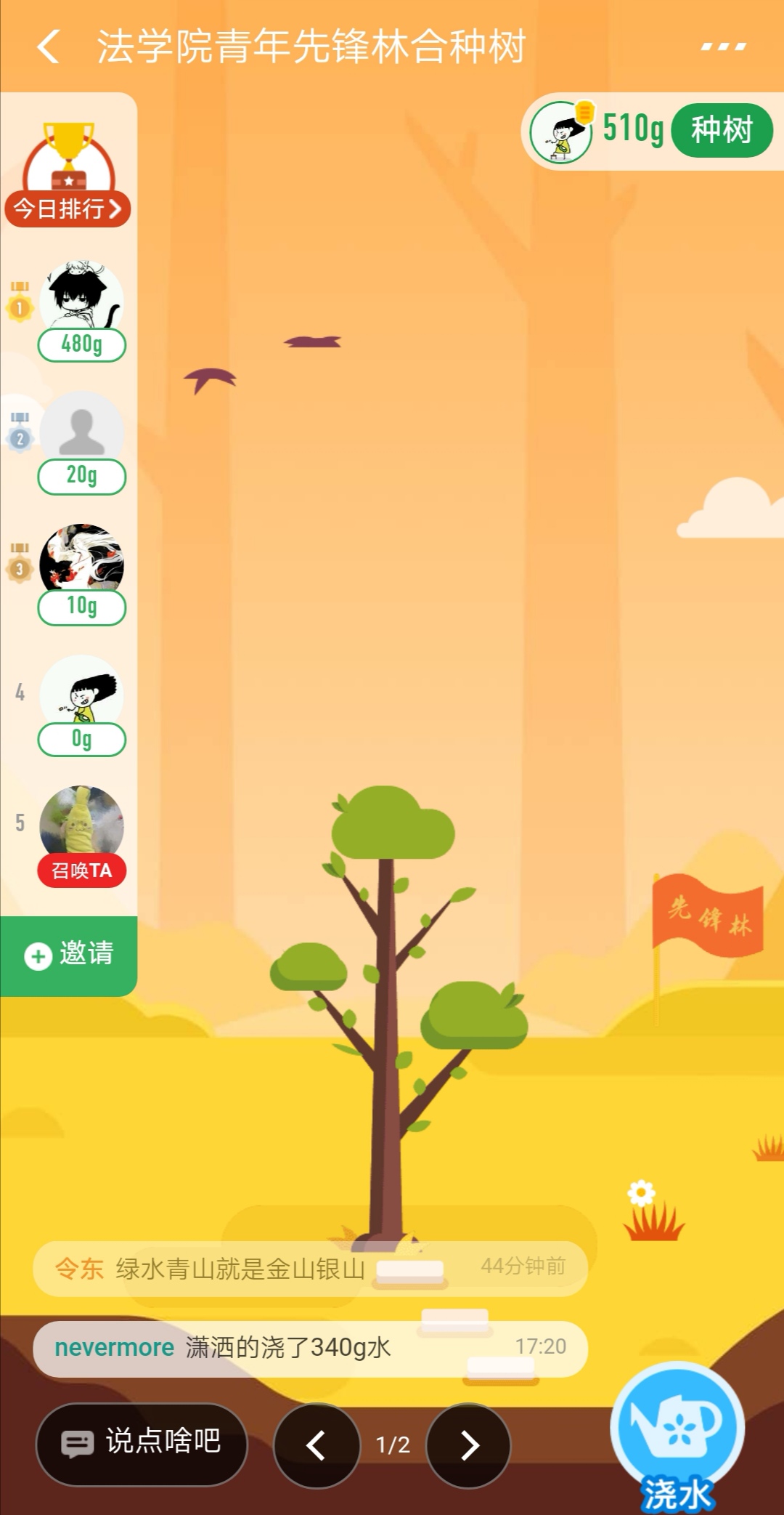 学生们通过支付宝中“蚂蚁森林”小程序参与,合种一片“法学院青年先锋林”,并写下对这个春天的美好祝福。待疫情结束后,公益组织将在武汉播撒下这一份份爱心。学生们在线上相互助力,通过每日行走、线上办公、绿色交通等有益于地球、个人的绿色生活方式获取“蚂蚁森林”能量水,为树苗浇水,播撒绿意,帮助树苗成长为参天大树。社会工作专业1901班史昊同学说到,“作为新时代的大学生,我们享受着上一辈人留下的美如画的风景,但同时也承担着保护它们的责任,通过种树,能够美化周边,保护生态环境,改善空气质量。今年植树节,我们一起‘云种树’,用心播种一片绿荫,保护生态环境,携手共建美丽中国。”