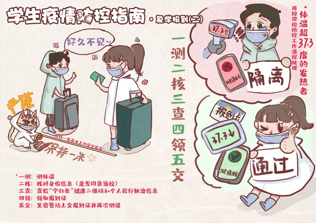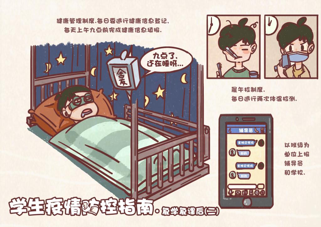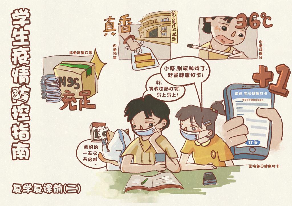 这组漫画版校园疫情防控指南共19张,从复学复课前、复学报到、复学复课后三个部分详细说明了学生在疫情防控常态化下如何做好自身的安全防护和校园疫情防控。