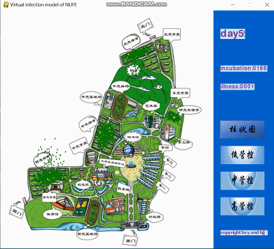 该模型基于南财地图,以python为编程工具,同时使用pygame引擎,模拟在低、中、高三种管控下的校园疫情传染情况。模型中设置健康、潜伏期、患病三种人群,在寝室、教室和食堂三个区域移动的场景,采取没有措施的低管控、戴口罩等低级防护的中管控、增设隔离区等严密防护的高管控三种场景,实现在不同传染率下的模型。通过实现可视化的GUI、学生活动随机化的算法、使用字典的检测优化算法,以及人员分布数据的图表等,使大家更直观清晰地获得校园里同学们流动下的传染状况,同时提醒各位同学,在校期间,服从学校管理,务必在宿舍进行自我隔离,做好个人防护,尽量减少出行,避免校园里扩大感染范围。