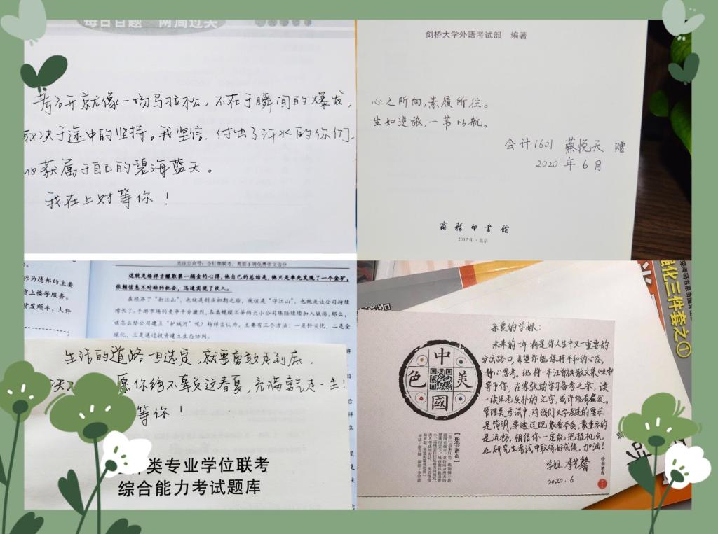 已被北京大学拟录取的阮雪璠在看到学院倡议时第一时间报名参加,她传递的书籍是《大学生数学竞赛习题讲解》,整本书被她写满了知识点和笔记,她在扉页写道:“想来你一定对数学抱有极高热情、且乐于挑战自我,相信这本书会给你带来无尽的乐趣。学好高等数学,可以培养你的思维能力,我受益于这本书,希望你也一样。”已被拟录取上海财经大学资产评估专硕的孙妍将自己的考研材料传递给了资产评估1701班何钰菲同学,收到材料的何同学说道:“我也打算考上海财经大学,很高兴有这样的机会可以收到学姐的资料,对于现阶段居家备战考研的我十分有意义,帮我节省了搜集考试资料的时间,能有更多的时间来备考。同时,学姐的考研成功也让我更加有动力,这些资料像是种鼓励,也是份祝福,希望我今年能够考研成功。”拿到英国利兹大学、华威大学等多所世界名校offer的蔡悦天写道:“心之所向,素履所往,希望学弟学妹们努力拼,加油闯。”此外,还有拟录取南京大学审计硕士的李艺馨、收到伦敦大学offer的王颖娴等多名同学参与了传递活动。