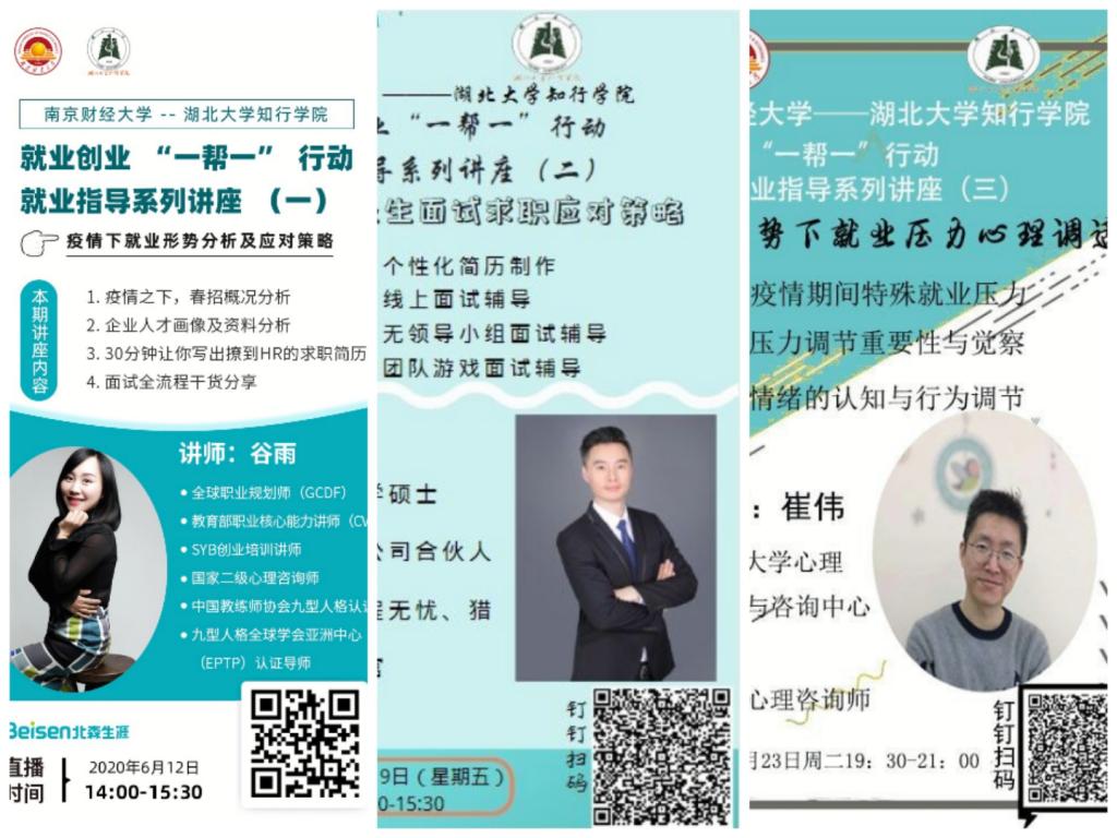 6月12日至23日,面向beat365英国官方网站和湖北大学知行学院2020届毕业生的系列就业指导讲座线上开讲,专业人才测评公司合伙人郭伟、北森生涯职业讲师谷雨、beat365心理咨询师崔伟分享了疫情形势下就业形势、求职简历与面试、心理压力与调试等内容,带领两校毕业生一起解读当下的就业形势,学习必要的面试技巧,提高毕业生疫情期间的就业意识和竞争力。1000多名学生聆听了讲座,并进行了线上咨询互动。