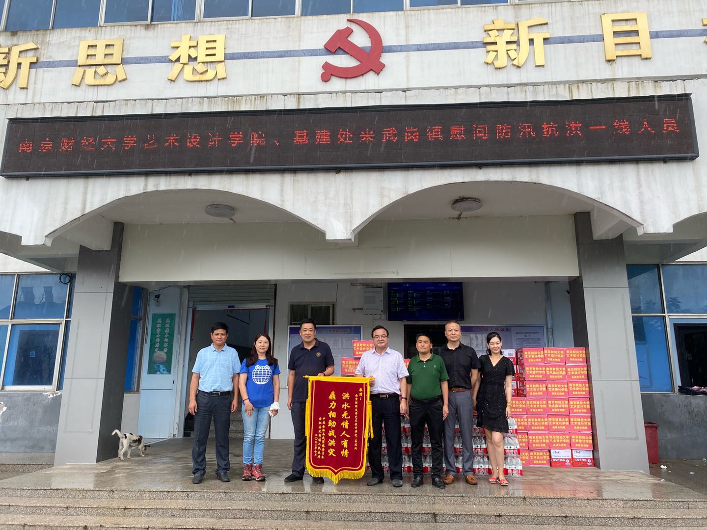 艺术设计学院党委连同校基建处党支部共向武岗镇捐赠矿泉水和方便面等防汛抗洪物资共计5000元。随后,周翔书记带领与会人员前往抗洪一线进行走访慰问。