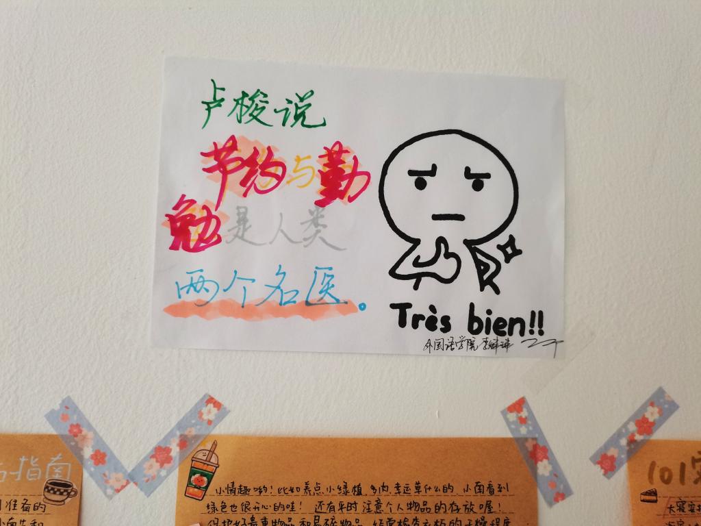 外国语学院学生制作了一系列由诙谐幽默、直击心灵的警示语配图的卡通小漫画,张贴在开水间、垃圾桶和电灯开关旁,提醒人们节约水电、避免浪费并注重垃圾分类。活动发起者外语院法语2001班李炜玮说:“勤俭日非常值得我们去关注和了解,现在很多同学买一杯奶茶拍完照片喝几口就扔掉了,我觉得保持勤俭不仅仅是嘴上喊出的口号,更应该引起对有限资源的珍视,从行动上抵制过度消费。”她发动身边的同学制作了这些宣传画,通过幽默的卡通形象再配上或严肃或诙谐的标语,希望让更多的学生熟悉世界勤俭日,了解勤俭的内涵,自觉养成勤俭节约的好习惯。小小的卡通漫画提醒同学们“一粥一饭,当思来处不易,半丝半缕,恒念物力维艰”。外国语学院党委书记李骏也注意到了学生们这些“巧心思”,她说:“通过这次活动,可以唤醒同学们勤俭节约的意识,也更能认识到‘勤俭’不应该埋没于典籍故纸堆中,也不仅仅是口头上的一句空话,我们只有从身边的小事做起,才能更好地保护我们的地球资源,维持社会可持续发展。”