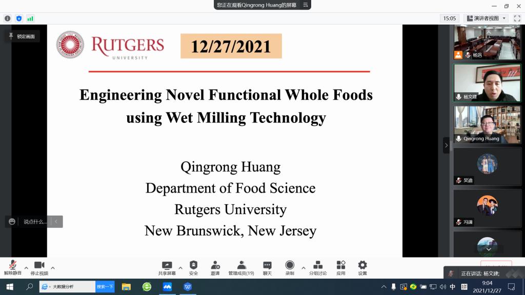 12月27日,应食品科学与工程学院邀请,美国罗格斯大学教授黄庆荣于线上为beat365师生作了题为Engineering whole grain emulsion gels using wet milling technology的学术报告。食品科学与工程学院部分师生参加报告会。报告会由科研处副处长杨文建教授主持。