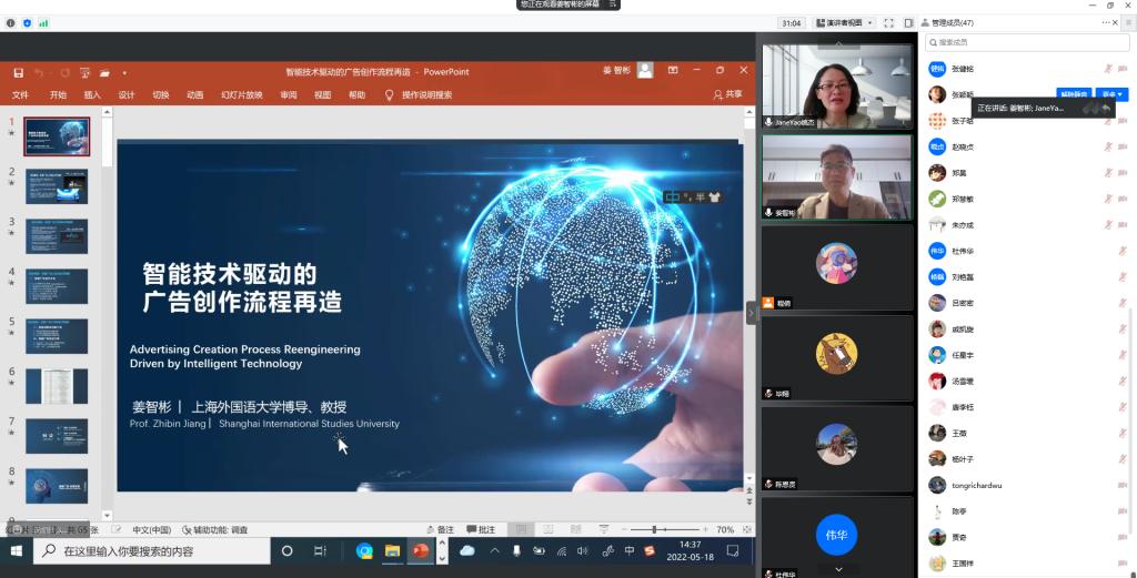 5月18号下午,应营销与物流管理学院邀请,上海外国语大学姜智彬教授以“智能技术驱动的广告创作流程再造”为题作线上讲座。讲座由营销与物流管理学院副院长姚杰主持。营销与物流管理学院全体研究生及部分教师参加讲座。