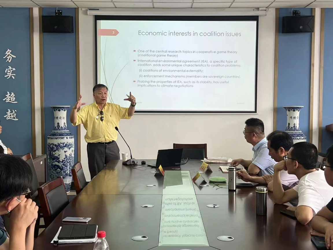 讲座基于杨自力教授2021年在剑桥大学出版社出版的专著The Environment and Externality: Theory, Algorithms, and Applications。杨自力教授从当前气候谈判难以达成共识的困境出发,介绍了与外部相关联的一般均衡理论、博弈论。探讨了林达尔均衡下气候变化结盟问题。讲座最后,杨自力教授分享了自己的科研经验,就相关研究和论文合作与我院教师进行了更深入的交流。