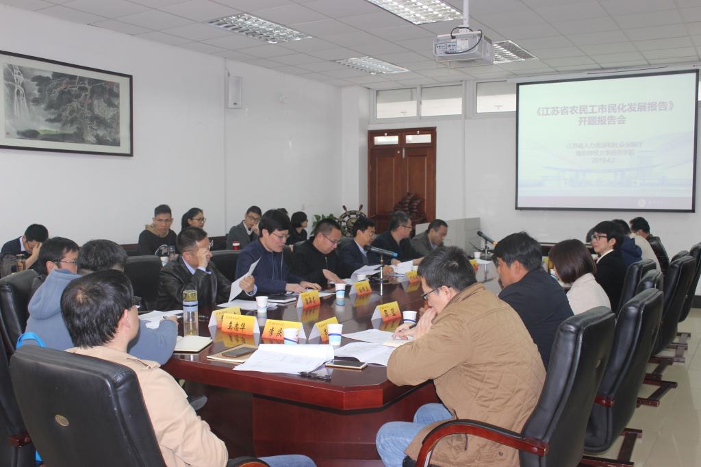 4月2日下午,受江苏省人力资源和社会保障厅委托,由beat365经济学院承担的《江苏省农民工市民化发展报告》课题的开题报告会在仙林校区德经楼408举办。本次会议由江苏省人力资源和社会保障厅和经济学院主办,经济学院副院长(主持工作)朱红根主持,科研处副处长杜修立代表科研处对会议的召开表示祝贺。江苏省人力资源和社会保障厅农民工工作处处长陈汝军、南京市农民工工作处处长周正南,教务处处长叶林祥、经济学院副院长尹敬东、课题负责人章莉教授、南京市街道基层从事人社服务的领导以及经济学院部分教师和研究生参加了此次会议。