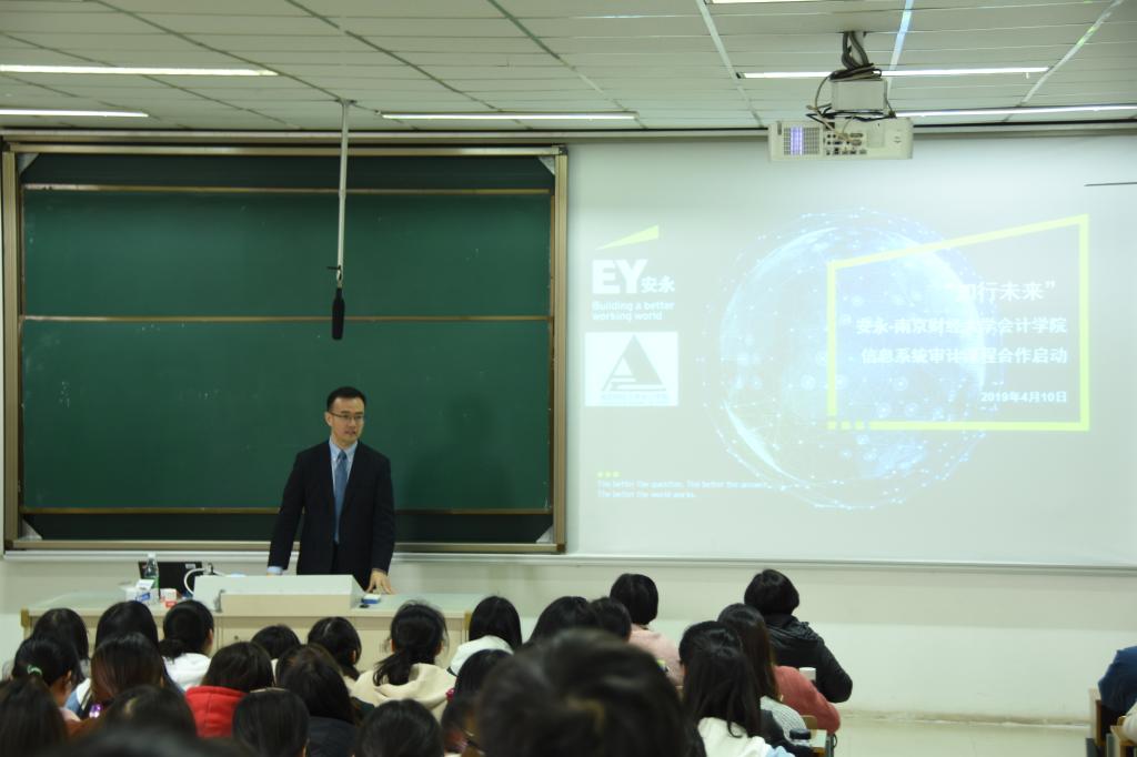 会计学院院长、江苏省会计教育协同发展中心主任姚文韵致欢迎辞。顾卿华先生致辞,他指出,举办活动的初衷就是要建立一个平台,把安永在信息科技审计实战中的经验和体会分享给南财学子。他简要介绍了本次系列讲座的时间安排和主要内容,希望大家能有所收获。杨政教授致辞,他简单介绍了会计教育专家委员会成立的背景、人员构成、宗旨及工作目标等。他指出,在“大智移云物”的冲击下,会计教育必须改革和创新,希望通过本次活动能够为会计专业教育改革积累宝贵经验,并推向全国。
