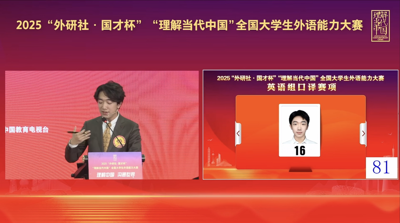 十二月的北京,寒意渐浓,却挡不住一场语言盛宴的炽热。2025年“外研社·国才杯”“理解当代中国”全国大学生外语能力大赛英语组口译赛项全国总决赛舞台上,一位身着深色西装的男生端坐其间,眼神沉静,姿态从容。
